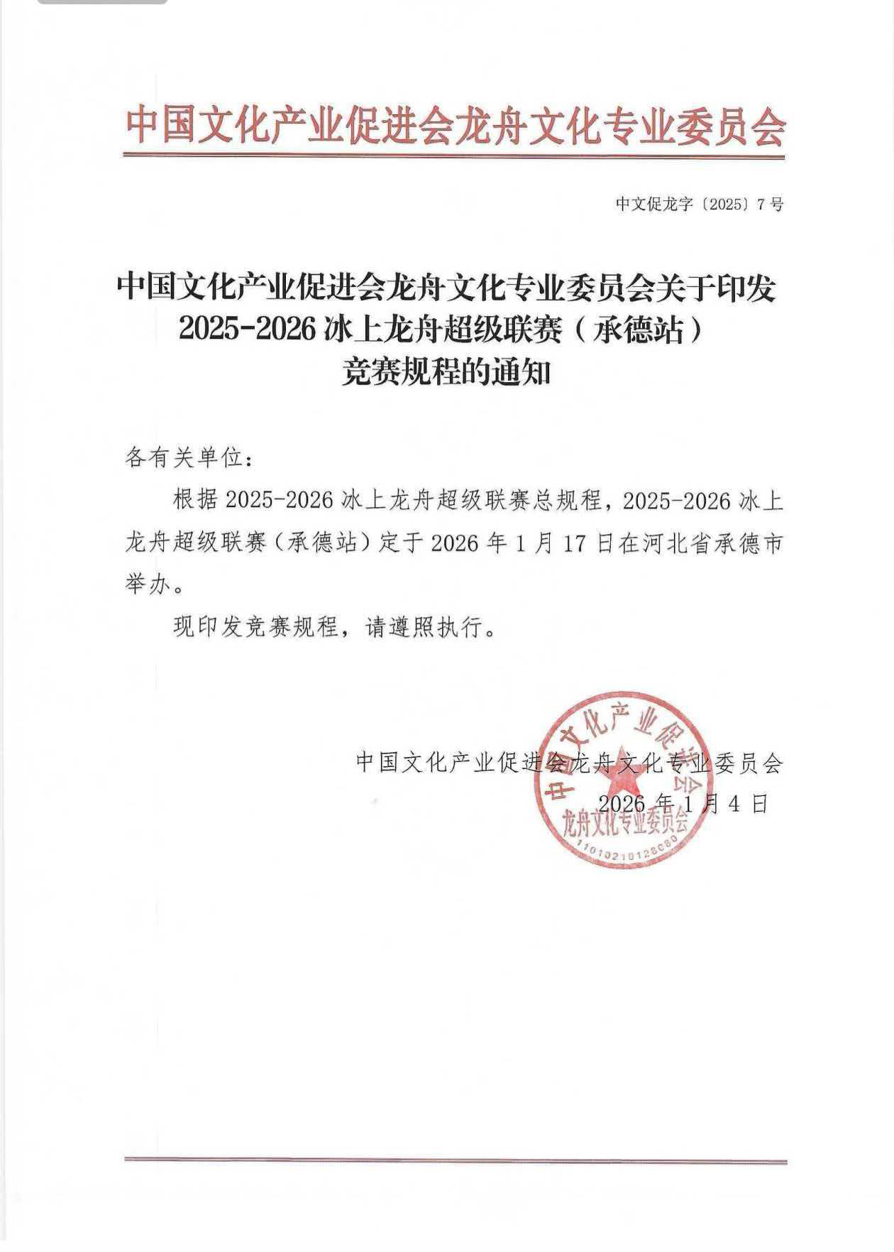 2025-2026冰上龙舟超级联赛(承德站)竞赛规程的通知